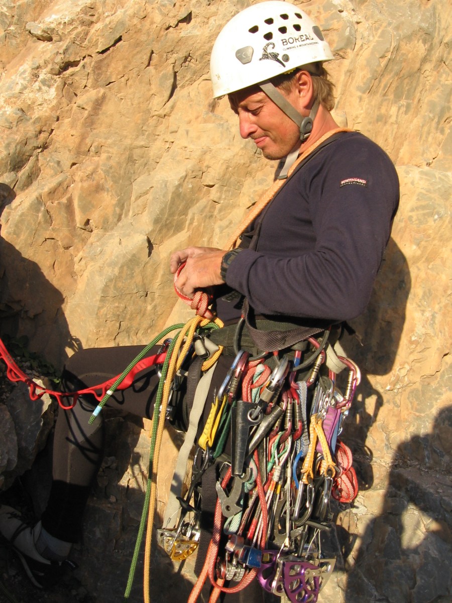 Для того кто лезет превым — 5-10 кг. В зависимости от сложности участка. Чем сложнее, тем больше снаряжения нужно.