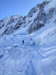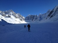 Сегодня делали вылазку под Les Courtes. С верхней станции Гран Монте на ледник съехали за 15 минут, еще 20 минут ушло на скиннинг по стену. Плюс минут 10 потратили на одевания скинов. Итого — 45 минут. Если сесть на первую канатку с рабочими, то под машрутами можно оказаться довольно рано.