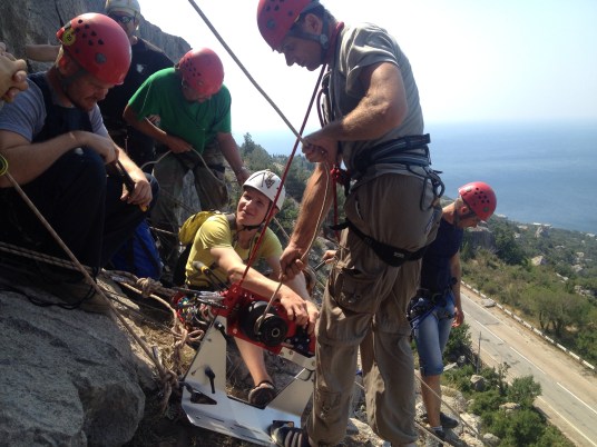 Участников собралось столько, что не все поместились на скальной полке на Рыжей скале. Каждый хотел попробовать новую лебёдку в работе, а также новые носилки Petzl от ФАиС Москвы и компании «Альпиндустрия».