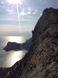 Andy Scott. Маршрут «The rising tide», E3. Маршрут оправдал название. Пока Анди лез, начался прилив. Сначало залило все камни, потом пришлось перекочевать на полку, потом на стенку. Бегство от океана