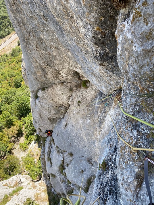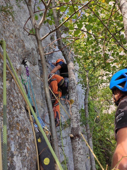 R4-R5. 55 м. С каменной пробки по стенке слева двигаться на и.т.о, затем лазанием вверх в мульду под нависанием. Далее лезть вверх-вправо в направлении дерева и больших каменных блоков. За деревом выйти на наклонную плиту, подняться по ней к началу полки с травой. По полке пройти вправо к деревьям (липа с несколькими стволами) в основании вертикальной стены. 15 м, VI, 40 м, III.