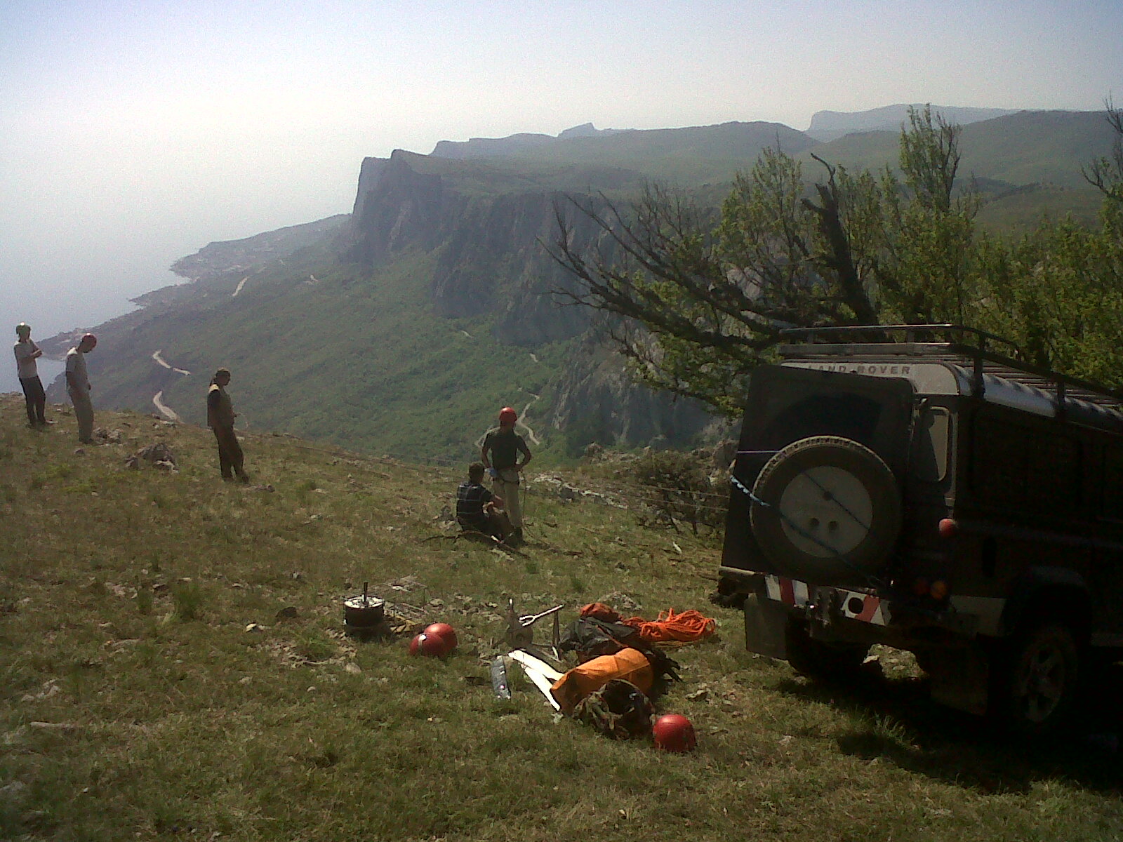 Отлично получилось с использованием двух лебёдок одновременно. Из-за сложного рельефа — вертикальные участки перемежались наклонными полками с бурной растительностью — пришлось использовать двух сопровождающих. Тянуть одной лебёдкой трёх человек было бы тяжело…